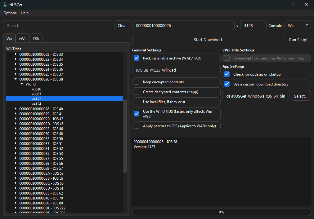 IOS>IOS 38>Worldand selectv4123. UncheckKeep encrypted contents. CheckUse a custom download directoryand select the folder that your NUSGet executable is in, then clickStart Download.