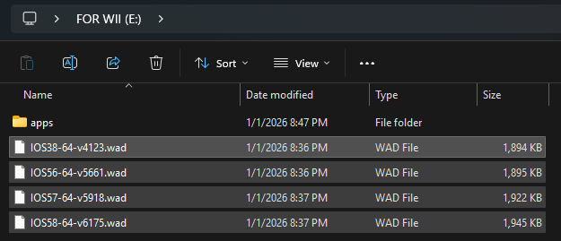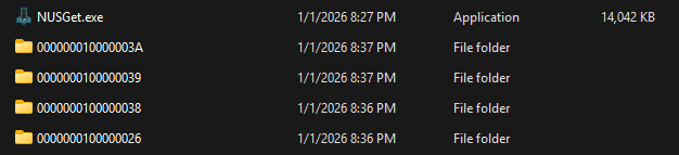IOS 56 (v5661),IOS 57 (v5918)andIOS 58 (v6175).When you have finished downloading the above IOS, navigate to the folder where your NUSGet executable is stored. This should now contain four different folders with the title IDs for the above IOS.