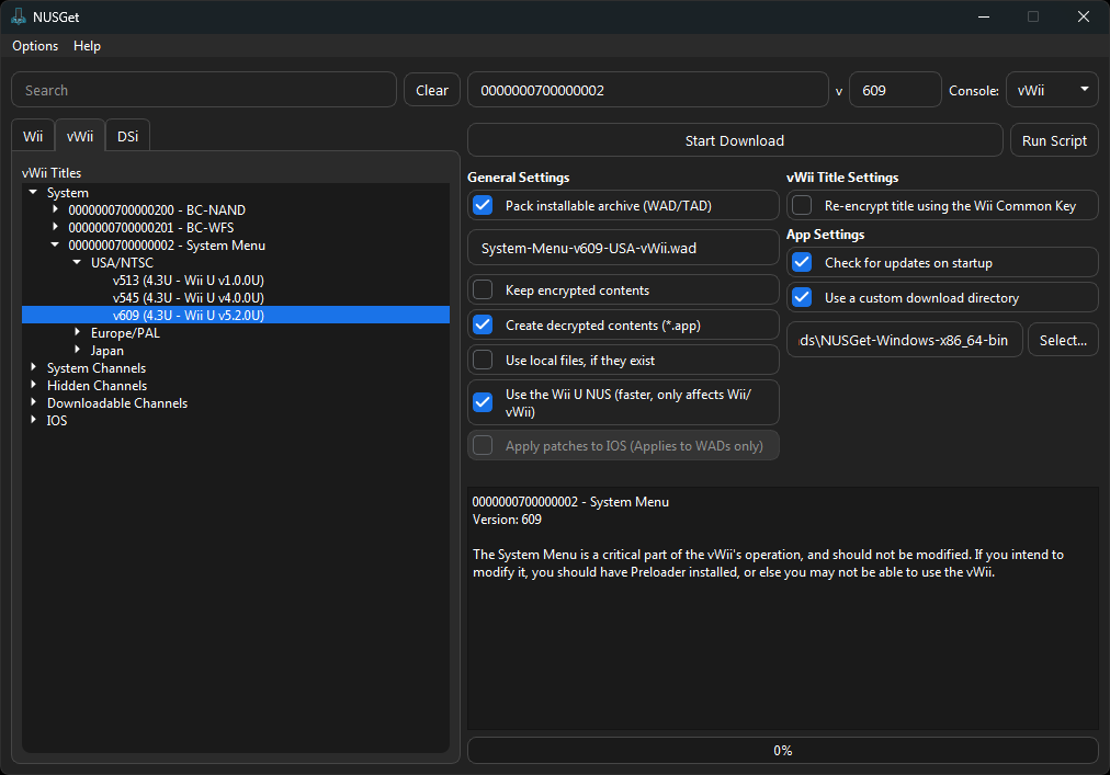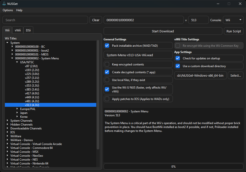 System>System Menu>Your Regionand then select the Wii menu version you are running. Check theCreate decrypted contents (*.app)option. CheckUse a custom download directoryand select the folder that your NUSGet executable is in, then clickStart Download.