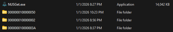 When you have finished the above steps, navigate to the folder where your NUSGet executable is stored. This should now contain three different folders with the title IDs for the downloaded IOS and Wii menu files.