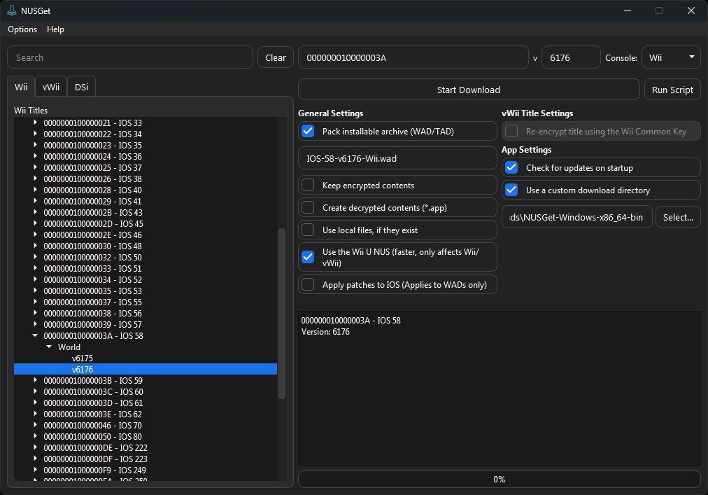 IOS>000000010000003A - IOS 58>World>Latest Version. UncheckKeep encrypted contents. CheckUse a custom download directoryand select the folder that your NUSGet executable is in, then clickStart Download.