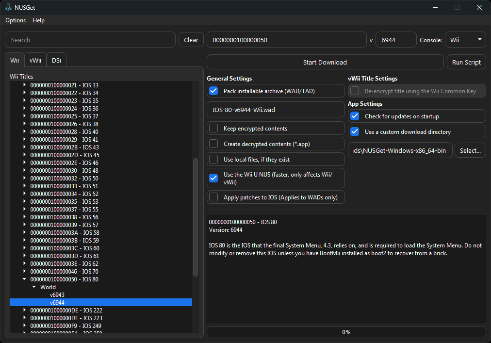 IOS>0000000100000050 - IOS 80>World>Latest Version. UncheckKeep encrypted contents. CheckUse a custom download directoryand select the folder that your NUSGet executable is in, then clickStart Download.