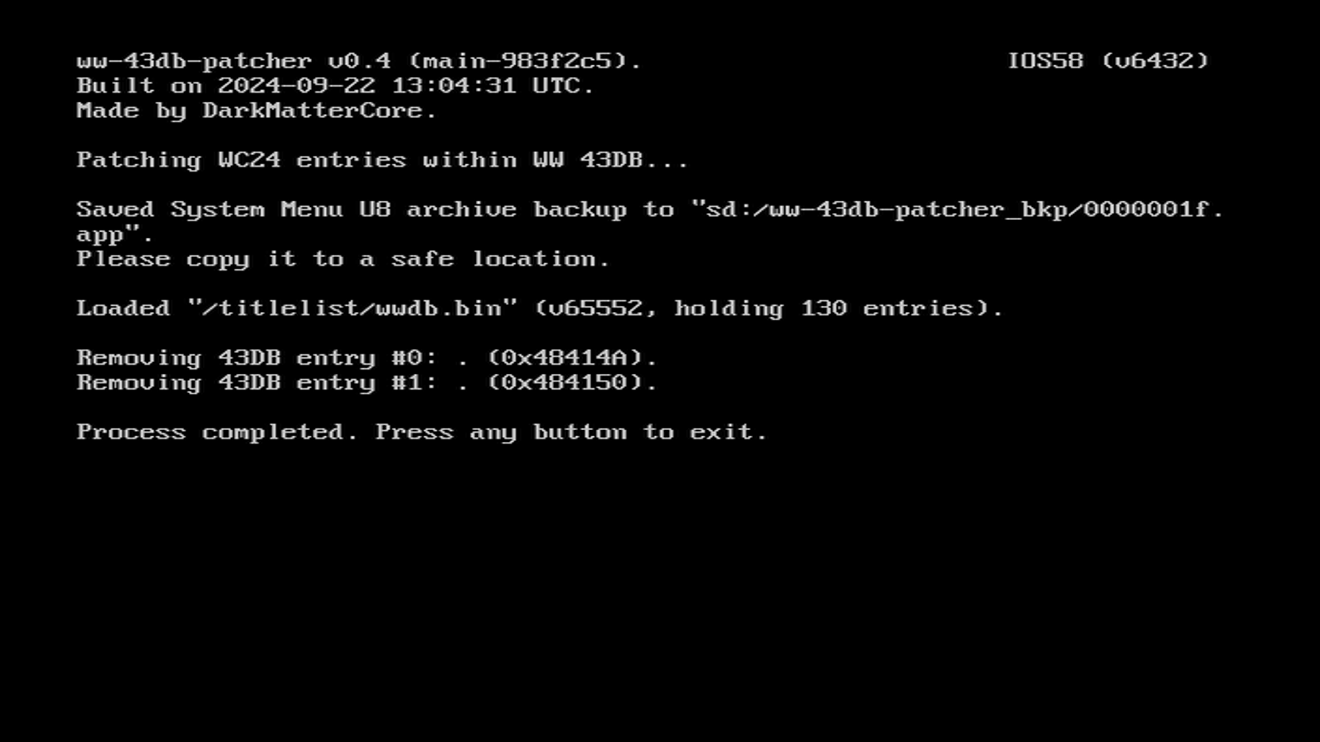 Once the aspect ratio database is patched, the installer will save a backup of the previous database. Do NOT delete this backup. You may press any button to return to the Homebrew Channel.