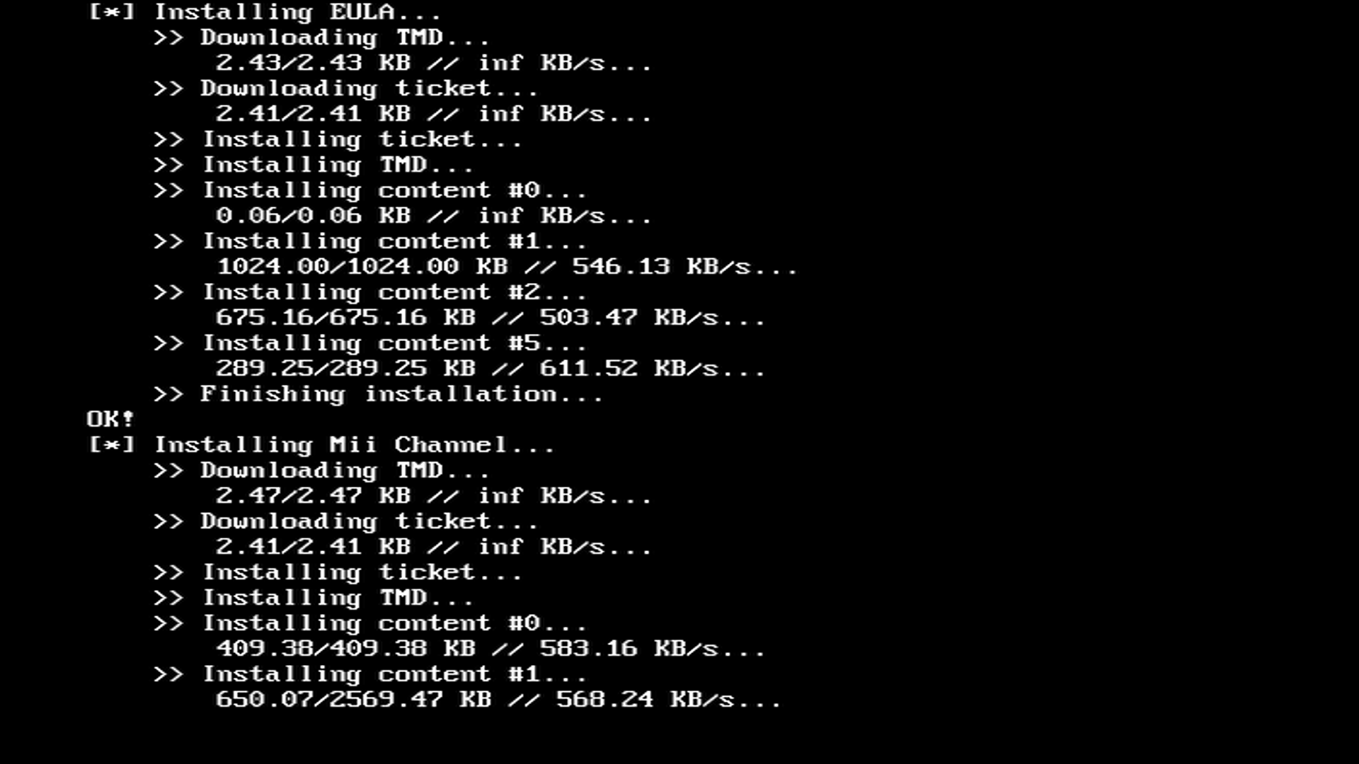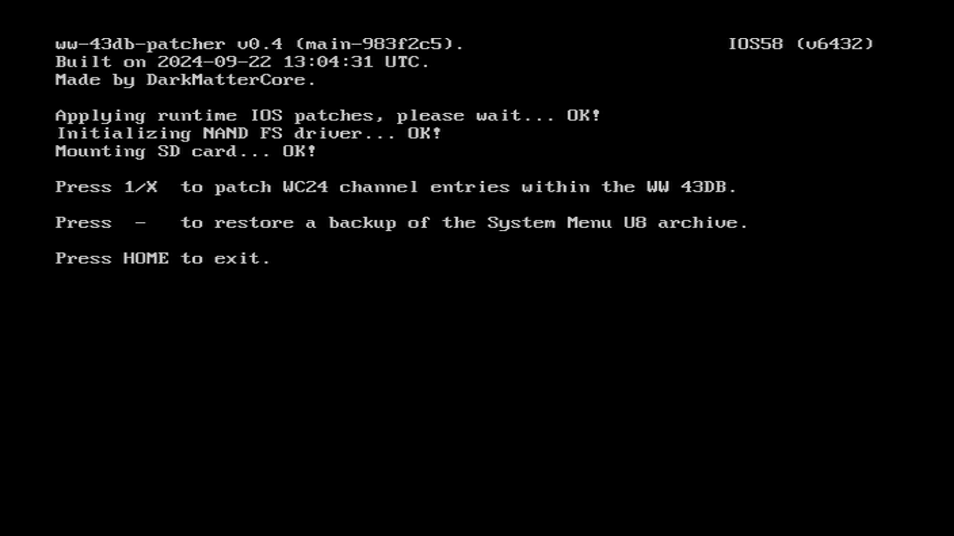 After continuing, the installer will patch and install IOS80. Once it is complete, you may press any button to return to the Homebrew Channel.