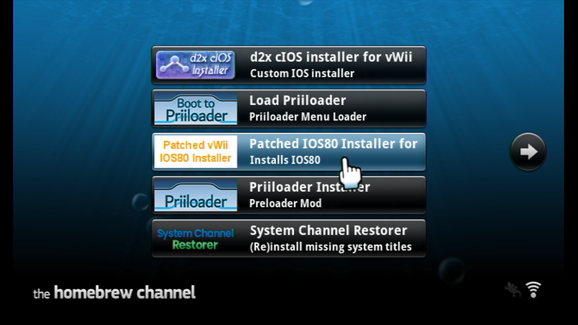 Launch Patched IOS 80 Installer for vWii from the list of homebrew.