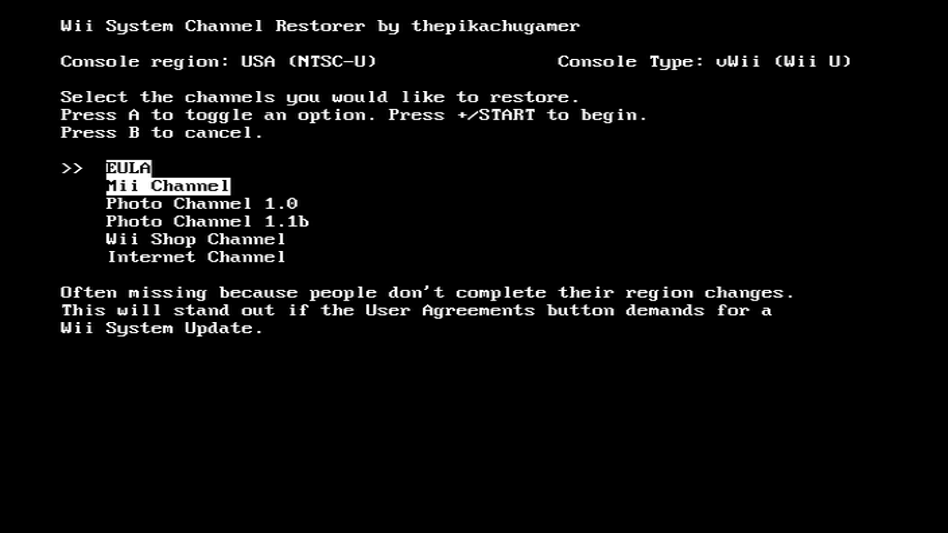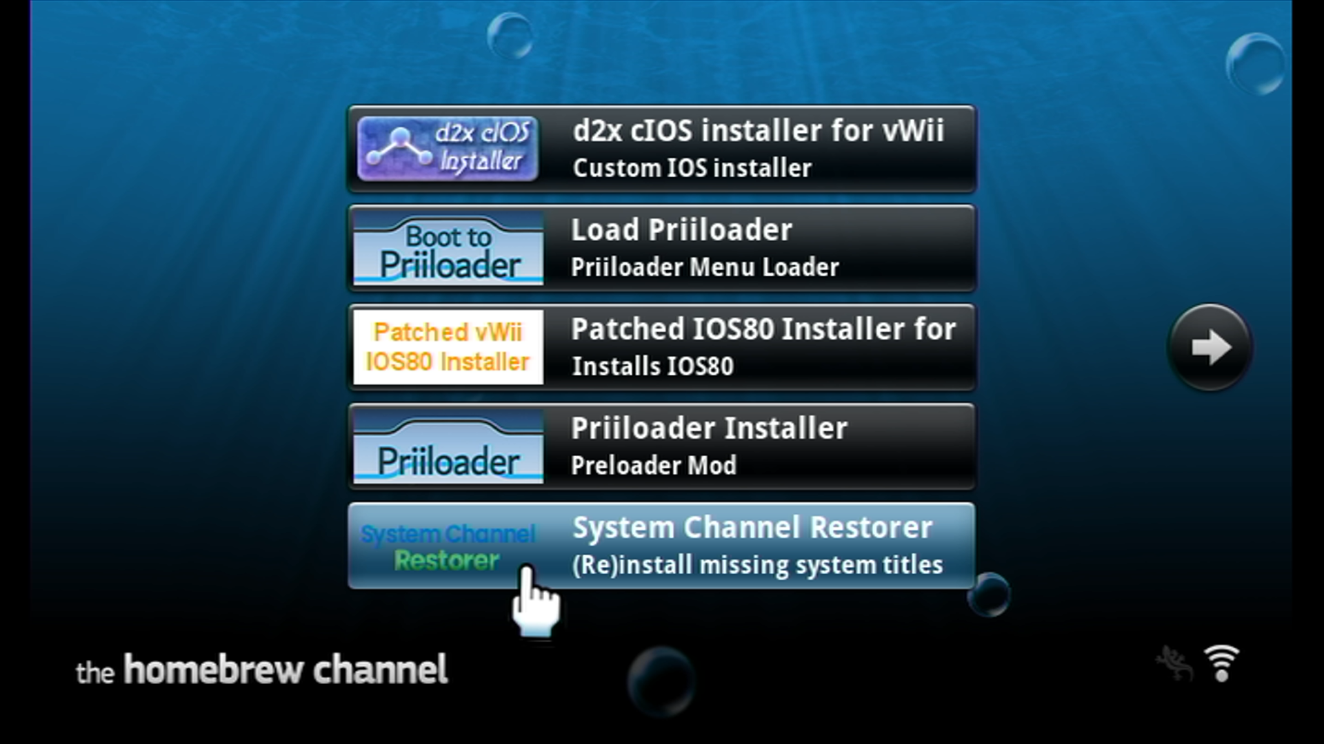 System Channel Restorer is a homebrew app that restores channels missing from the vWii menu normally, such as the Wii version of the Mii Channel and Photo Channel.