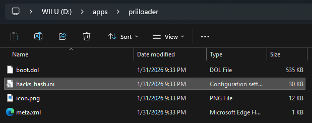SD:/apps/priiloaderand openhacks_hash.iniwith a text editor such as notepad.