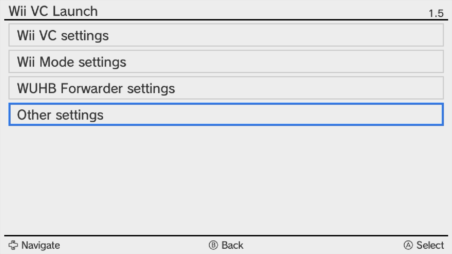 L++DPAD Down+- Minuscombination on your Gamepad/Pro Controller/Classic Controller, or theB++Control Pad Down+- Minuscombination on your Wii Remote to open the Wii U Plugin System Config Menu. Find theWii VC Launchmenu option and pressA.