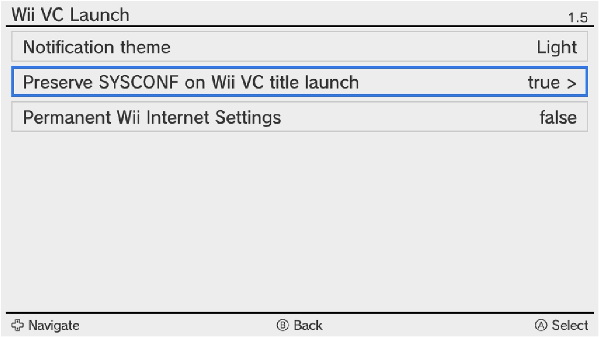 Preserve SYSCONF on Wii VC title launchoption is set totrue. Once this is finished, you may exit the config menu by pressingBuntil you are at the Wii U menu.