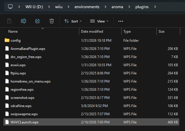 WiiVCLaunch.wpsfile to your SD card in the/wiiu/environments/aroma/pluginsdirectory.